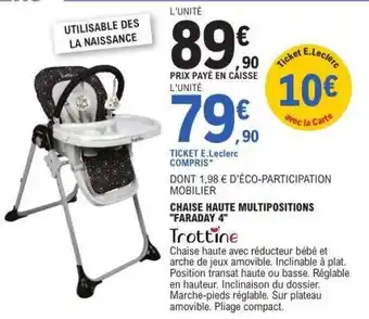En plus de l'offre CHAISE HAUTE MULTIPOSITIONS 'FARADAY 4', E.Leclerc propose une large gamme de produits. Consultez le Catalogue E.Leclerc hebdomadaire pour découvrir les meilleures offres et promotions. En plus de CHAISE HAUTE MULTIPOSITIONS 'FARADAY 4', il y a aussi : E.leclerc - chaise haute multipositions faraday 4, E.leclerc - chaise haute multipositions olea & Chaise haute fixe.