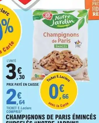 Actuellement en offre chez E.Leclerc : Champignons de Paris émincés surgelés 'Notre Jardin' ✅ Valable du 27-01 au 8-02.