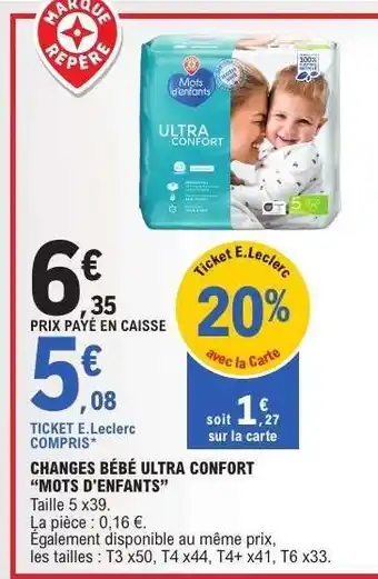 Découvrez les produits les moins chers parmi toutes les offres ! Si vous voulez savoir si E.Leclerc propose la meilleure remise pour Changes Bébé Ultra Confort 'Mots d'Enfants', comparez-la sur la page thèmes ou avec d'autres magasins.