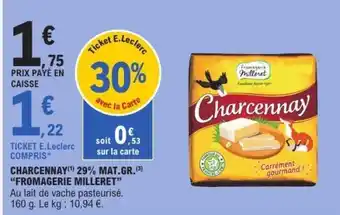 En plus de l'offre Charcennay, E.Leclerc propose une large gamme de produits. Consultez le Catalogue E.Leclerc hebdomadaire pour découvrir les meilleures offres et promotions. En plus de Charcennay, il y a aussi : FROMAGERIE MILLERET Charcennay 29% mat gr, FROMAGERIE MILLERET Charcennay au lait pasteurise & offre 3.