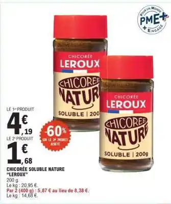 Actuellement en offre chez E.Leclerc : CHICORÉE SOLUBLE NATURE LEROUX ✅ Valable du 17-02 au 28-02.