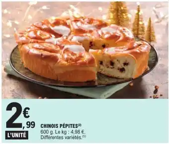 En plus de l'offre Chinois pépites, E.Leclerc propose une large gamme de produits. Consultez le Catalogue E.Leclerc hebdomadaire pour découvrir les meilleures offres et promotions. En plus de Chinois pépites, il y a aussi : LA FOURNEE DOREE Petits chinois, La fournée dorée - petits chinois & Pomelo chinois Origine Espagne/ Portugal.