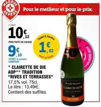 Actuellement en offre chez E.Leclerc : Clairette de Die AOP Tradition 'Rives et Terrasses' ✅ Valable du 24-02 au 8-03.