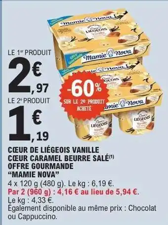 Actuellement en offre chez E.Leclerc : Cœur de Liégeois Vanille Cœur Caramel Beurre Salé 'Mamie Nova' ✅ Valable du 30-12 au 10-01.