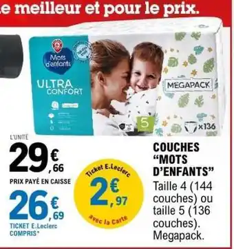 Actuellement en offre chez E.Leclerc : COUCHES “MOTS D’ENFANTS” ✅ Valable du 2-01 au 11-01.