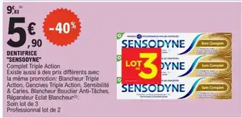 En plus de l'offre Dentifrice Sensodyne, E.Leclerc propose une large gamme de produits. Consultez le Catalogue E.Leclerc hebdomadaire pour découvrir les meilleures offres et promotions. En plus de Dentifrice Sensodyne, il y a aussi : Dentifrice Sensodyne, DENTIFRICE SOIN COMPLET TRIPLE ACTION 'SENSODYNE' & Sensodyne dentifrice expert protect répare et protège.