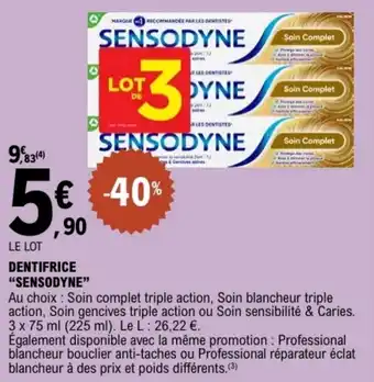 En plus de l'offre Dentifrice sensodyne, E.Leclerc propose une large gamme de produits. Consultez le Catalogue E.Leclerc hebdomadaire pour découvrir les meilleures offres et promotions. En plus de Dentifrice sensodyne, il y a aussi : Dentifrice Sensodyne, Dentifrice Sensodyne & DENTIFRICE SOIN COMPLET TRIPLE ACTION 'SENSODYNE'.