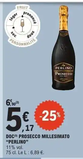 Actuellement en offre chez E.Leclerc : DOC PROSECCO MILLESIMATO PERLINO ✅ Valable du 30-12 au 10-01.