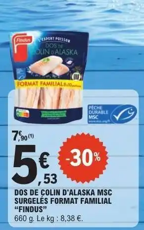 Actuellement en offre chez E.Leclerc : DOS DE COLIN D'ALASKA MSC SURGELÉS FORMAT FAMILIAL 'FINDUS' ✅ Valable du 10-02 au 21-02.