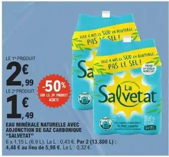 Actuellement en offre chez E.Leclerc : Eau minérale naturelle avec adjonction de gaz carbonique 'Salvetat' ✅ Valable du 20-01 au 31-01.