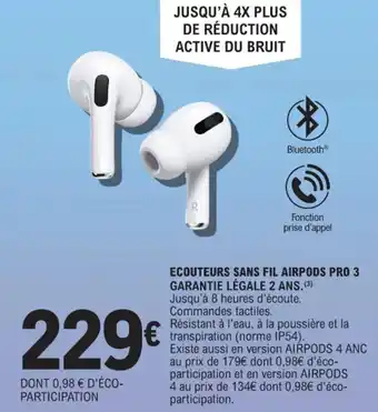 Offre Ecouteurs sans fil airpods pro 3 garantie légale 2 ans. (3) jusqu'à 8 heures d'écoute. chez E.Leclerc