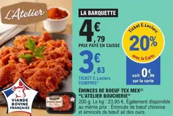 Actuellement en offre chez E.Leclerc : Éminces de boeuf tex mex l'atelier boucherie ✅ Valable du 10-03 au 21-03.