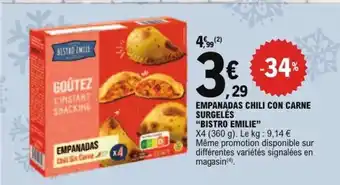 Actuellement en offre chez E.Leclerc : EMPANADAS CHILI CON CARNE SURGELÉS BISTRO EMILIE ✅ Valable du 30-12 au 10-01.