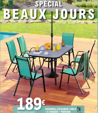 Actuellement en offre chez E.Leclerc : ENSEMBLE DÉJEUNER TABLE+6 CHAISES + PARASOL ✅ Valable du 21-04 au 9-05.