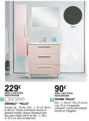 En plus de l'offre ENSEMBLE “PALLAS”, E.Leclerc propose une large gamme de produits. Consultez le Catalogue E.Leclerc Brico hebdomadaire pour découvrir les meilleures offres et promotions. En plus de ENSEMBLE “PALLAS”, il y a aussi : ENSEMBLE MEUBLE DOUBLE VASQUE + MIROIR “PALLAS”, Ensemble matelas & Ensemble bébé.