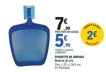 En plus de l'offre Épuisette de Surface, E.Leclerc propose une large gamme de produits. Consultez le Catalogue E.Leclerc hebdomadaire pour découvrir les meilleures offres et promotions. En plus de Épuisette de Surface, il y a aussi : Épuisette de surface, ÉPUISETTE DE SURFACE PRO & ÉPUISETTE DE SURFACE BEAUX JOURS.