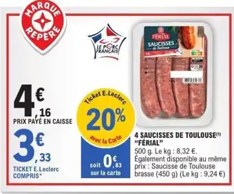 Actuellement en offre chez E.Leclerc : FÉRIAL 4 saucisses de toulouse ✅ Valable du 16-12 au 27-12.