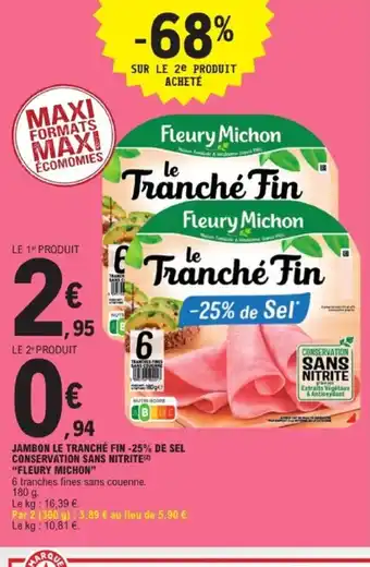 Actuellement en offre chez E.Leclerc : FLEURY MICHON Jambon le tranché fin -25% de sel conservation sans nitrite ✅ Valable du 3-03 au 14-03.