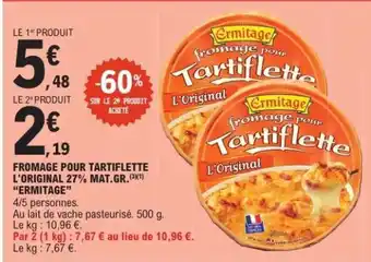 Actuellement en offre chez E.Leclerc : FROMAGE POUR TARTIFLETTE L'ORIGINAL 27% MAT.GR. ERMITAGE ✅ Valable du 24-02 au 7-03.