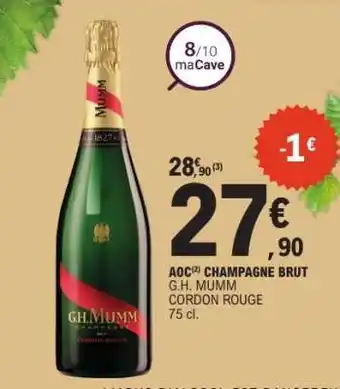 En plus de l'offre G.H. MUMM CORDON ROUGE, E.Leclerc propose une large gamme de produits. Consultez le Catalogue E.Leclerc hebdomadaire pour découvrir les meilleures offres et promotions. En plus de G.H. MUMM CORDON ROUGE, il y a aussi : A.O.P. Champagne Mumm Cordon rouge brut, A.O.P. Champagne Mumm Cordon rouge brut & G.H. MUMM AOC CHAMPAGNE BRUT ROSÉ.
