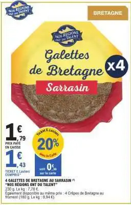 En plus de l'offre Galettes de Bretagne Sarrasin, E.Leclerc propose une large gamme de produits. Consultez le Catalogue E.Leclerc hebdomadaire pour découvrir les meilleures offres et promotions. En plus de Galettes de Bretagne Sarrasin, il y a aussi : 4 Galettes de Bretagne au Sarrasin, 4 Galettes de Bretagne au Sarrasin & NOS RÉGIONS ONT DU TALENT 4 galettes de bretagne au sarrasin.