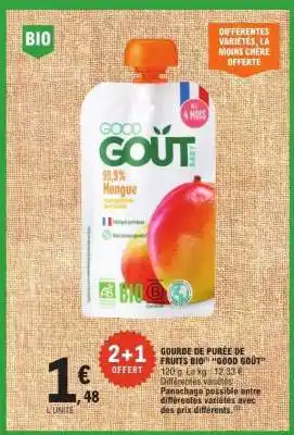 Actuellement en offre chez E.Leclerc : GOURDE DE PURÉE DE FRUITS BIO GOOD GOÛT ✅ Valable du 7-04 au 18-04.