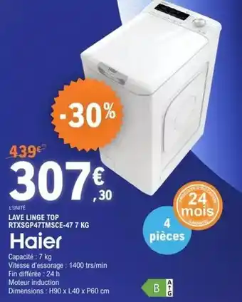 Actuellement en offre chez E.Leclerc : Haier - lave linge top rtxsgp47tmsce-a7 ✅ Valable du 7-01 au 3-02.