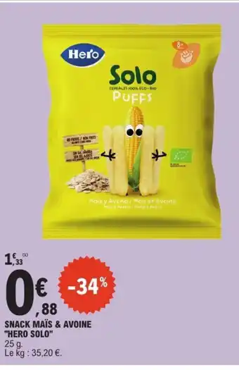 Actuellement en offre chez E.Leclerc : HERO SOLO Snack maïs & avoine ✅ Valable du 17-02 au 21-02.
