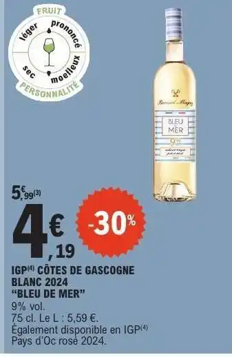 Actuellement en offre chez E.Leclerc : IGP CÔTES DE GASCOGNE BLANC 2024 “BLEU DE MER” ✅ Valable du 30-12 au 10-01.