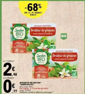 Actuellement en offre chez E.Leclerc : Infusion ou thé vert bio 'Jardin Bio Étic' ✅ Valable du 30-12 au 10-01.