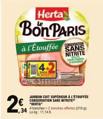 JAMBON CUIT SUPÉRIEUR À L'ÉTOUFFÉE CONSERVATION SANS NITRITE 'HERTA' offres et promotions en ligne chez E.Leclerc