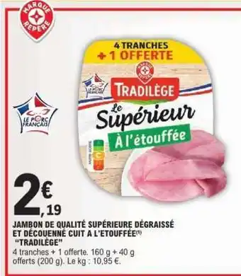 Actuellement en offre chez E.Leclerc : JAMBON DE QUALITÉ SUPÉRIEURE DÉGRAISSÉ ET DÉCOUENNÉ CUIT A L'ETOUFFÉE ✅ Valable du 14-04 au 25-04.