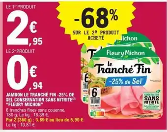 Offre JAMBON LE TRANCHÉ FIN -25 % DE SEL CONSERVATION SANS NITRITE FLEURY MICHON chez E.Leclerc