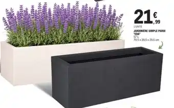 En plus de l'offre JARDINIÈRE SIMPLE PAROI, E.Leclerc propose une large gamme de produits. Consultez le Catalogue E.Leclerc hebdomadaire pour découvrir les meilleures offres et promotions. En plus de JARDINIÈRE SIMPLE PAROI, il y a aussi : POT ROND SIMPLE PAROI EDA, POT CARRÉ SIMPLE PAROI EDA & JARDINIÈRE DOUBLE PAROI 'VOLCANIA UP DE EDA'.