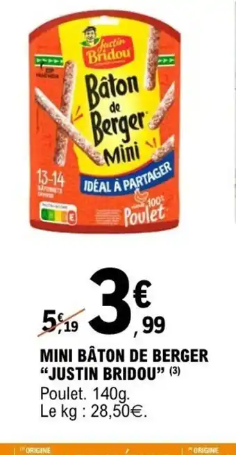 L'offre est disponible dans plusieurs magasins, vérifiez tous les produits pour obtenir le JUSTIN BRIDOU Mini bâton de berger le moins cher. Si vous souhaitez savoir si l'article est en vente avec une plus grosse remise dans un autre magasin, consultez la catégorie 'Supermarché'. Ces offres pourraient aussi vous intéresser : JUSTIN BRIDOU Mini bâton de berger, Justin bridou bâton de berger mini nature & Bâton de berger mini nature justin bridou.