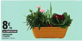 En plus de l'offre LA COMPOSITION, E.Leclerc propose une large gamme de produits. Consultez le Catalogue E.Leclerc hebdomadaire pour découvrir les meilleures offres et promotions. En plus de LA COMPOSITION, il y a aussi : Composition coeur, Composition 2 Plantes & Composition en verrerie.