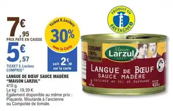 Actuellement en offre chez E.Leclerc : LANGUE DE BOEUF SAUCE MADÈRE MAISON LARZUL ✅ Valable du 6-01 au 17-01.