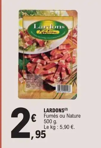 Actuellement, Lardons est en promotion chez E.Leclerc. Toutes les informations utiles comme le prix, les conditions et la durée de validité sont affichées sur cette page. Consultez également les promotions similaires pour Lardons, afin de faire le meilleur choix. La promo Lardons est valable du 27-01-2026 au 31-01-2026. Si elle est expirée, regardez les autres offres équivalentes. Vous pouvez aussi suivre cette catégorie de produit pour être alerté lorsqu’une nouvelle promotion Lardons apparaît chez E.Leclerc.Questions fréquemment posées au sujet de Lardons