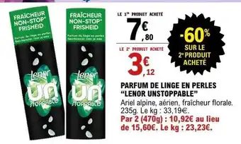 En plus de l'offre Lenor Unstoppable, E.Leclerc propose une large gamme de produits. Consultez le Catalogue E.Leclerc hebdomadaire pour découvrir les meilleures offres et promotions. En plus de Lenor Unstoppable, il y a aussi : LENOR Adoucissant, Lenor - parfum de linge en perles lenor fraicheur de coton & Lenor - adoucissant concentré.