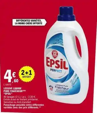 Actuellement en offre chez E.Leclerc : LESSIVE LIQUIDE PURE FRAÎCHEUR 'EPSIL' ✅ Valable du 3-02 au 14-02.