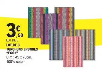 En plus de l'offre LOT DE 3 TORCHONS EPONGES “ECO+”, E.Leclerc propose une large gamme de produits. Consultez le Catalogue E.Leclerc hebdomadaire pour découvrir les meilleures offres et promotions. En plus de LOT DE 3 TORCHONS EPONGES “ECO+”, il y a aussi : LOT DE 4 TORCHONS “ECO+”, Lot 2 torchons & Lot de 2 torchons Léon.