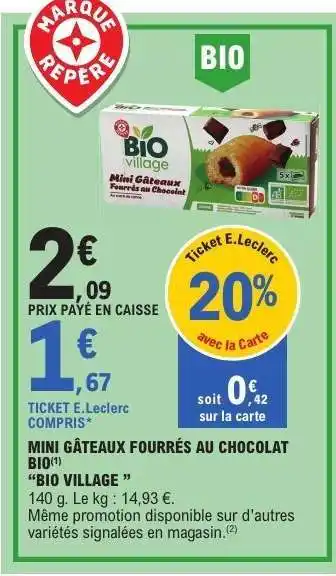 Offre MINI GÂTEAUX FOURRÉS AU CHOCOLAT BIO chez E.Leclerc
