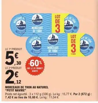 Actuellement en offre chez E.Leclerc : Morceaux de thon au naturel 'Petit Navire' ✅ Valable du 14-04 au 25-04.