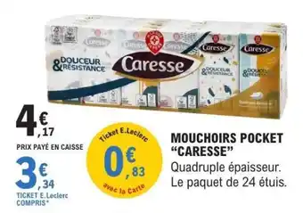 Actuellement en offre chez E.Leclerc : MOUCHOIRS POCKET “CARESSE” ✅ Valable du 27-01 au 8-02.