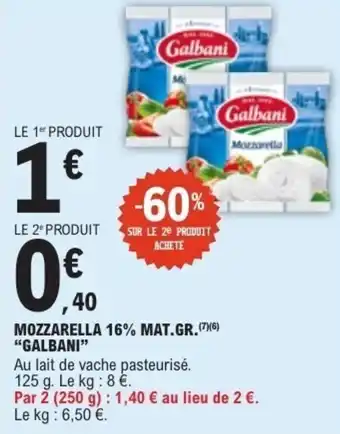Actuellement en offre chez E.Leclerc : Mozzarella 16% mat.gr. galbani ✅ Valable du 10-03 au 21-03.