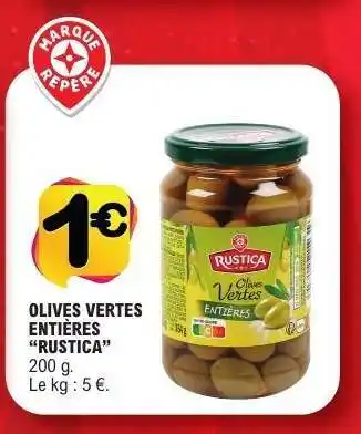 Actuellement en offre chez E.Leclerc : OLIVES VERTES ENTIÈRES “RUSTICA” ✅ Valable du 3-03 au 14-03.