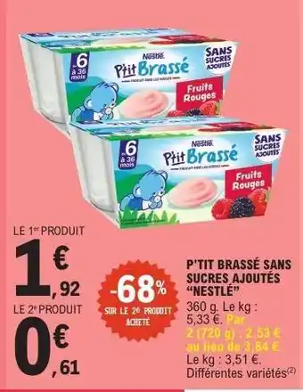 Actuellement en offre chez E.Leclerc : P'tit Brassé Sans Sucres Ajoutés Nestlé ✅ Valable du 28-04 au 9-05.