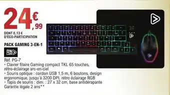 En plus de l'offre Pack gaming 3-en-1, E.Leclerc propose une large gamme de produits. Consultez le Catalogue E.Leclerc hebdomadaire pour découvrir les meilleures offres et promotions. En plus de Pack gaming 3-en-1, il y a aussi : GAMING Ecran gaming g3 24, Bureau gaming & Chaise gaming.