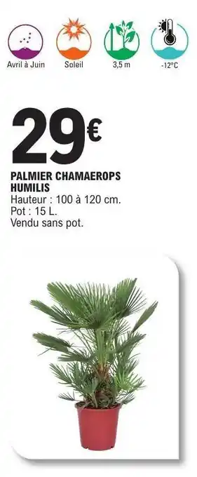 En plus de l'offre PALMIER CHAMAEROPS HUMILIS, E.Leclerc propose une large gamme de produits. Consultez le Catalogue E.Leclerc hebdomadaire pour découvrir les meilleures offres et promotions. En plus de PALMIER CHAMAEROPS HUMILIS, il y a aussi : Chamaerops humilis, PALMIER DE CHINE CHAMAEROPS EXCELSA & Palmier.