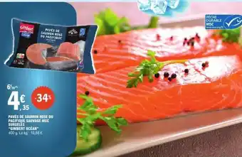 Actuellement en offre chez E.Leclerc : Pavés de Saumon Rose du Pacifique Sauvage MSC Surgelés 'Gimbert Océan' ✅ Valable du 3-03 au 14-03.